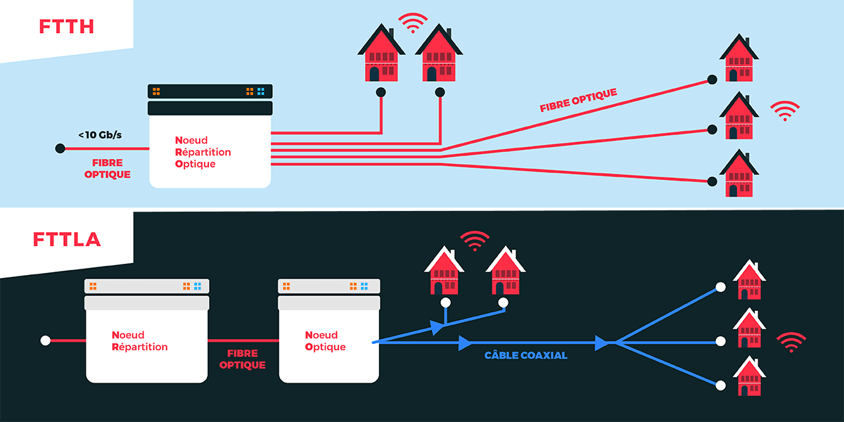 – FFTLA : Fibre jusqu'au Dernier Amplificateur. Dans ce cas, la fibre optique est tirée jusqu'au dernier répartiteur de la rue ou du quartier. Et la terminaison au domicile de l'abonné se fait avec un autre type de câble, très souvent du câble coaxial.
